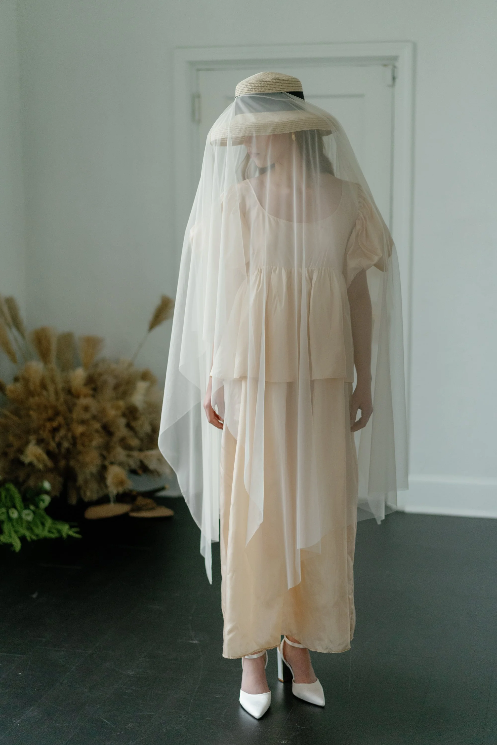 Anytime Meghan Savage dreams up a shoot, we are on board. For this one she wanted something organic, natural and sculptural to pop against the white walls of La Villa. We had a lot of pampas grass leftover from previous weddings so we wanted to reuse it, but with a new look. So we chopped off the ends to make a flat. It gave it new life and as the focal point. Kaylee Peile styled the chic dresses from Madeline Marie and a bridal gown from L’eto Bridal. MacKenzie Ruybalid did hair and makeup on model Cydney Jo Weber.