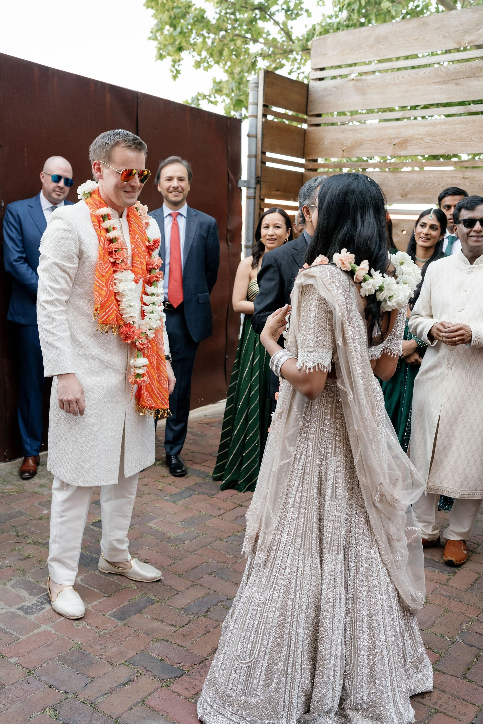 Jason rode in on horse for the Baraat and met Kavya with a carnation garland to start the ceremony. We decorated the mandap with layers of blush fabric, hanging carantion garlands and large sections of florals. The garlands and fabric fluttered in the wind and Kavya could not have looked prettier spinning in her dress underneath.