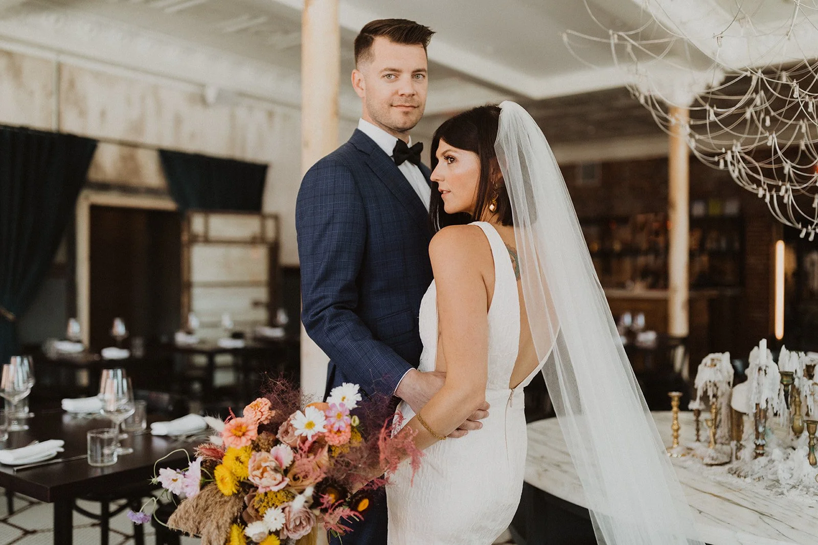 After our first look, we headed to Lazia, the light-filled Italian restaurant within the Crossroads Hotel to start taking couple photos. We hit up West Bottoms Whiskey and the Bloch Building at the Nelson Atkins Museum of Art for a few more and then snuck out during the reception for some amazing blue hour shots.
